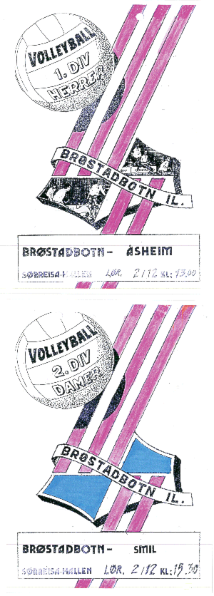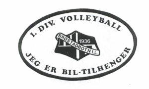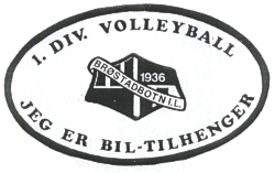 Da volleyballaget kom opp i 1. divisjonen, tegna jeg utkast til et klistremerke (vedlegg 5), mest tenkt til å ha bak på bilen. Jeg husker det ble produsert i blå farge på hvit bunn.
